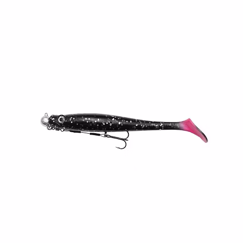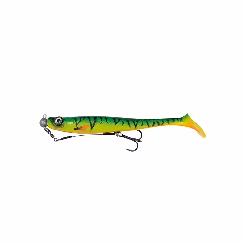 Swimbait i mjukt gummi med härlig och rullande aktion som triggar fisken att hugga. Supermjuk, men ändå tålig. Kommer riggad med ett jigghuvud från Mustad.